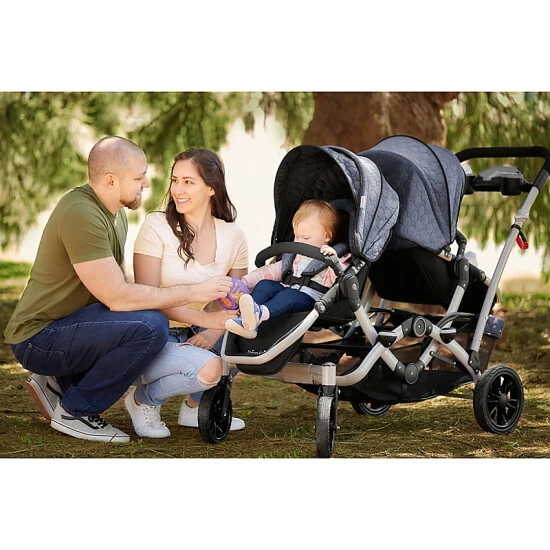 - Oversized, adjustable canopy with a convenient peek a boo window provides shade for both children